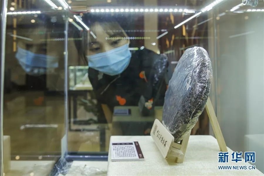 5月21日,在位于北京通惠河畔的中华古茶博物馆,一名观众在首场展览活动——“大道遗真:馆藏普洱茶专题展”上观看一饼“号级茶”。