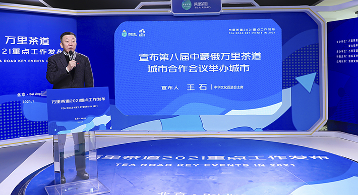 1月13日,“万里茶道2021重点工作发布”活动在北京搜狐媒体大厦举行。中华文化促进会主席王石,中华文化促进会主席团咨询委员金坚范,中华文化促进会副主席、万里茶道协作体执行主席郭杰,中华文化促进会理事、万里茶道协作体常务副主席刘登林,中华文化促进会理事、驻会副秘书长江力;锡林郭勒盟行政公署副盟长吴潮科,多伦县委副书记、县长王延功,县委常委、常务副县长何明鉴,县委常委、副县长文江,文体旅游广电局局长侯利军;搜狐集团运营及人力资源副总裁张雪梅,搜狐网总编辑王海涛等出席。