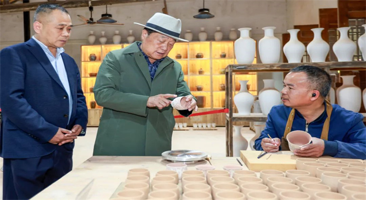人间多青绿,春风渐清朗。古老的黄龙湖马口陶技艺犹如春天的新芽,在传承与保护中,逐渐焕发新的生机。在马口陶工艺坊,熊召政先生听取了工作人员介绍黄龙湖马口陶制作工艺,手工拉坯和剔花工艺深深吸引了熊召政先生近步上前观摩,并与匠人亲切交流制作工艺要领。